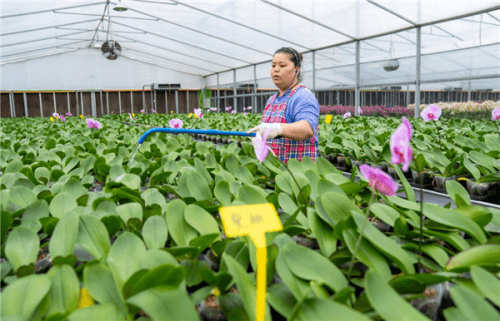 走进这里的兰花温室,你会发觉这里气温宜人,干爽通风,偌大的温室规整地分布蝴蝶兰的苗种、成品,工人正忙碌地对蝴蝶兰苗种喷水、修剪……一年四季,这里繁花不断,绿意盎然。