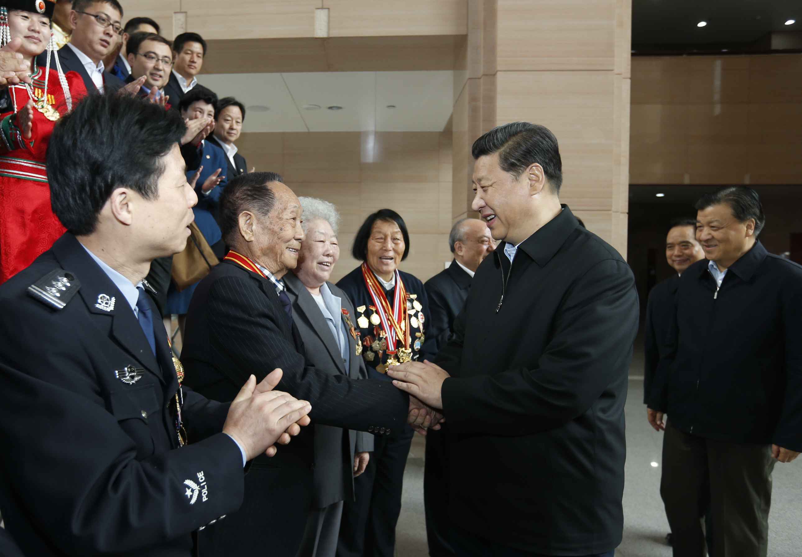 2013年4月28日,习近平总书记来到全国总工会机关,同全国劳动模范代表座谈并发表重要讲话。这是总书记同袁隆平亲切握手。