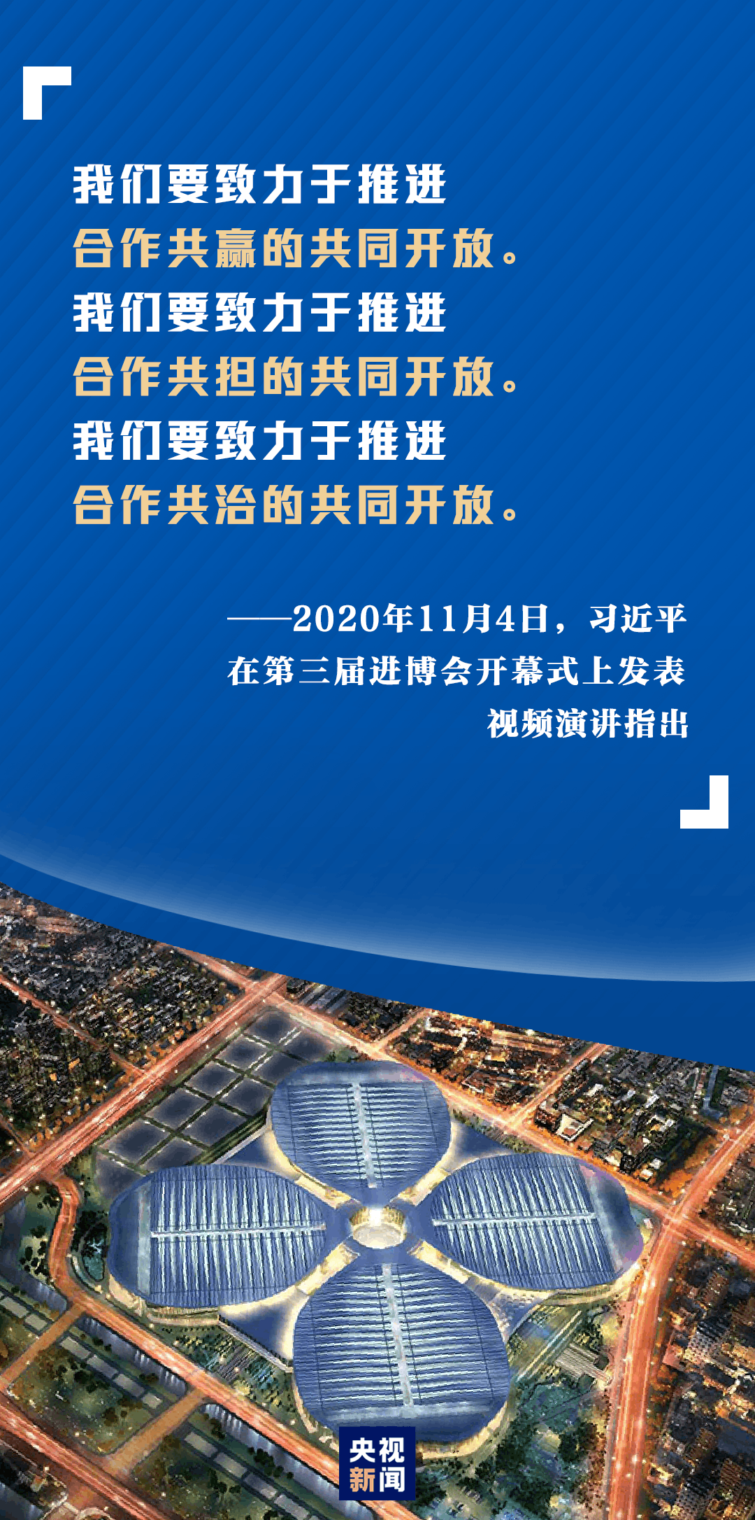“中国将秉持开放、合作、团结、共赢的信念,坚定不移全面扩大开放。”